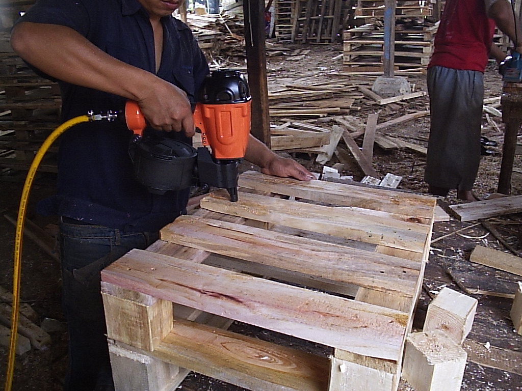 Perakitan palet (Assembly) dengan Peneumatic Coil Nailer